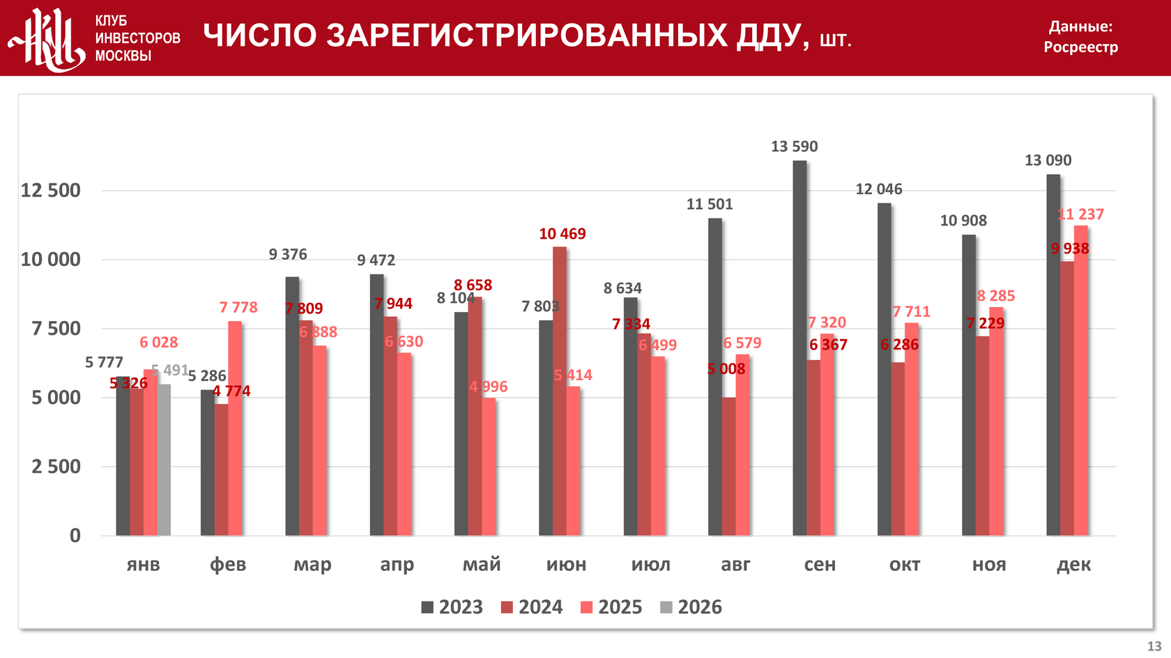 По итогам января 2026 года в Москве в отношении жилой недвижимости было зарегистрировано 5 491 договор участия в долевом строительстве (ДДУ) на объекты жилой недвижимости, что на 8,9% меньше и на 3,1% больше значения аналогичного показателя в 2025 и 2024 годах соответственно: