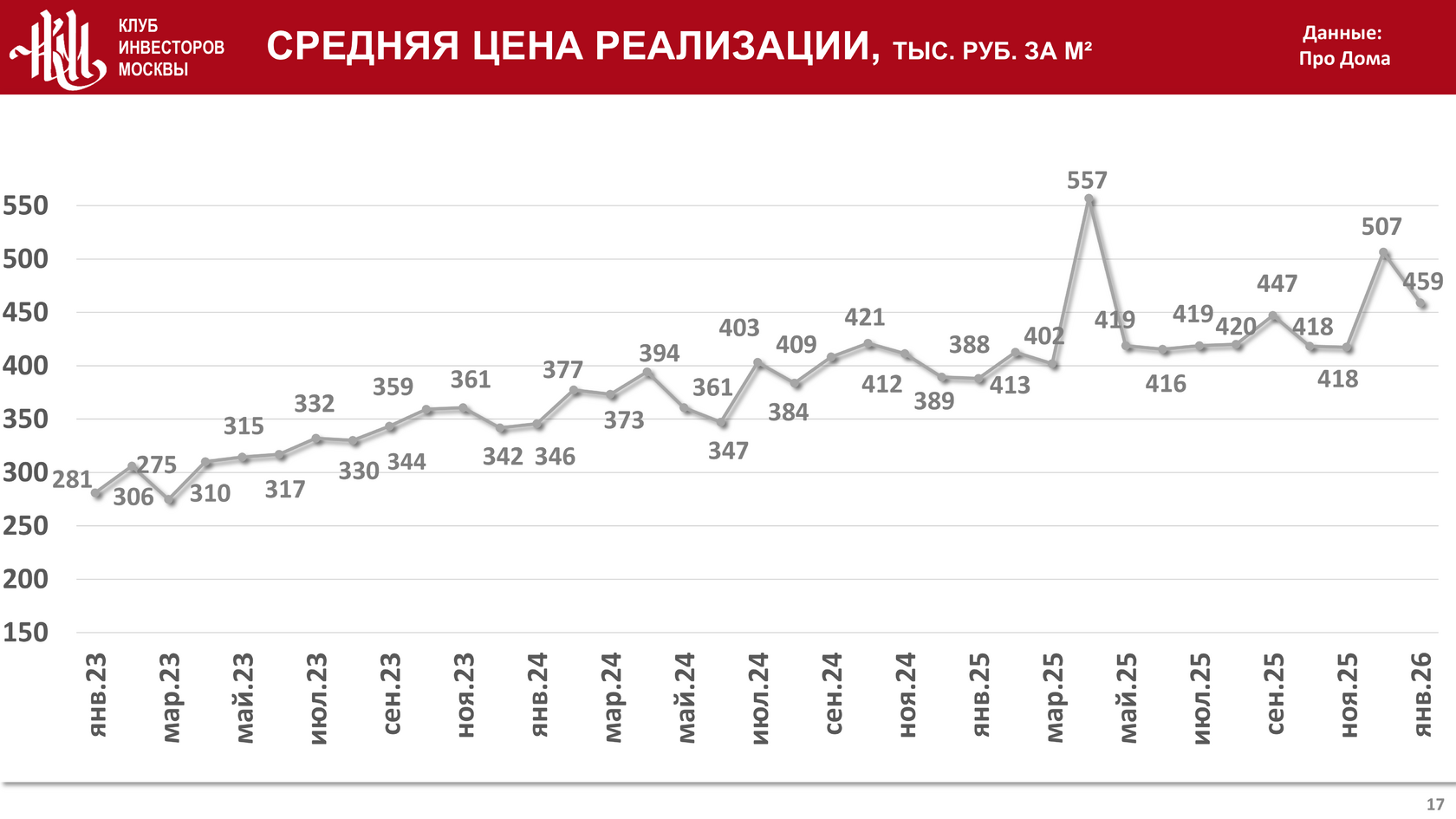 Средняя цена реализации в январе 2026 года составила 459 тыс. руб. за кв. м. что на 18,3% и на 32,7% больше значения аналогичного показателя в 2025 и 2024 годах соответственно: