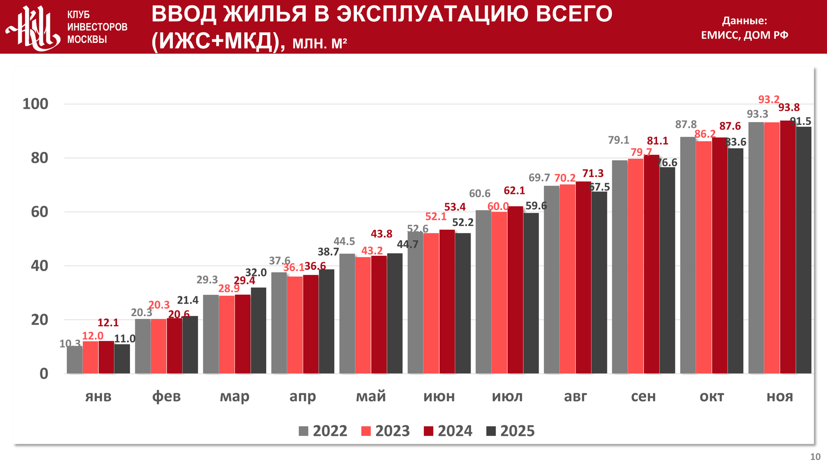 Суммарный объем ввода жилья в эксплуатацию в прошедшем году составил 108 146 тыс. кв. м. По сравнению с 2024 годом объем ввода жилья не изменился, и упал на 2,1% по сравнению со значением аналогичного показателя в 2023 году: