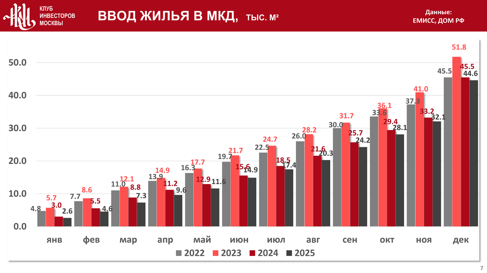 Фактический объем ввода с начала года в эксплуатацию многоквартирных жилых домов (МКД) составил 44 604 тыс. кв. м., что на 2% и на 13,8% меньше, чем на конец декабря 2024 и на конец декабря 2023 года соответственно: