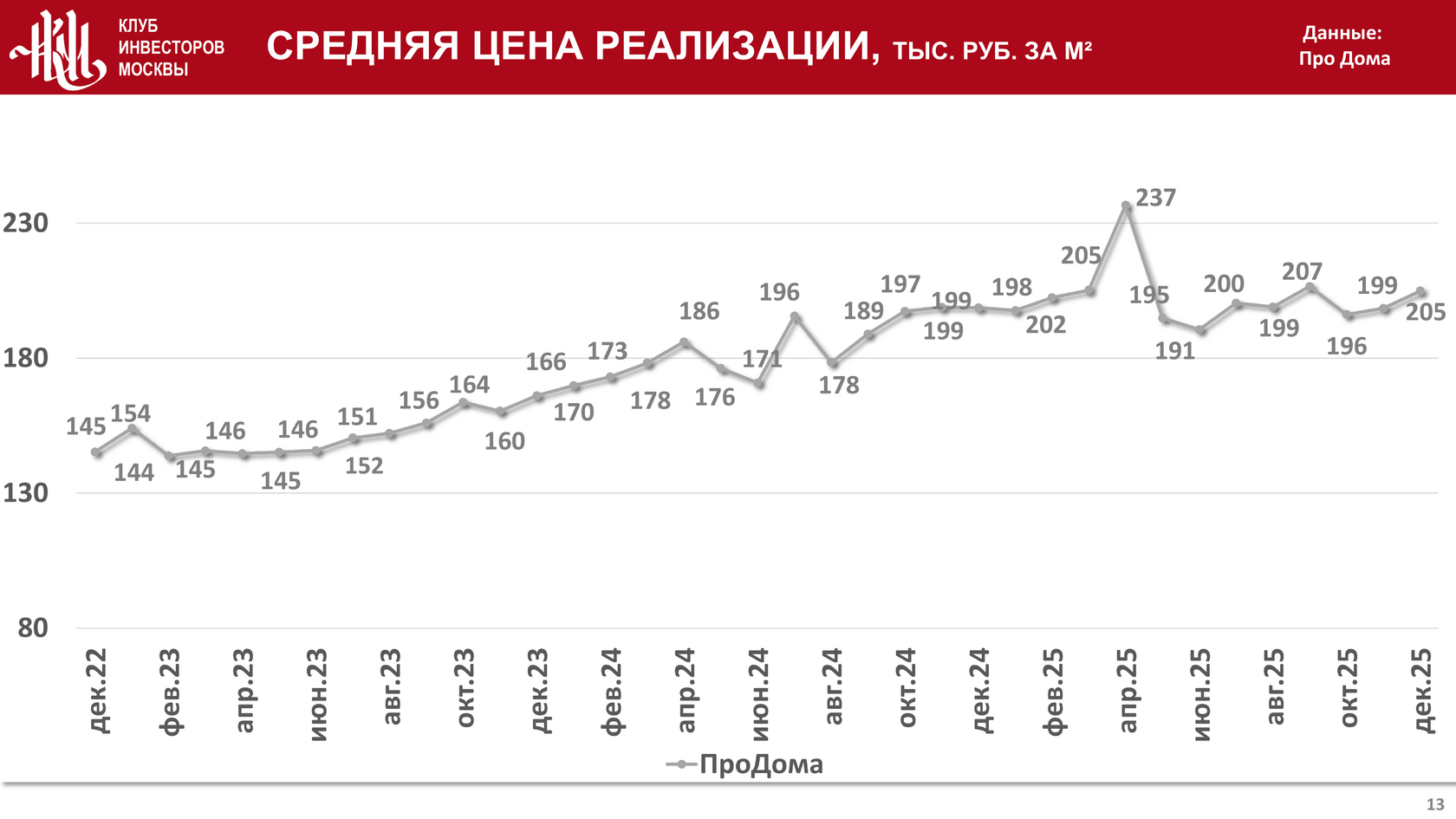Средняя цена реализации составила 204,9 тыс. руб. за кв. м., что на 3,1% меньше и на 23,4% больше аналогичного показателя в декабре 2024 и в декабре 2023 года соответственно: