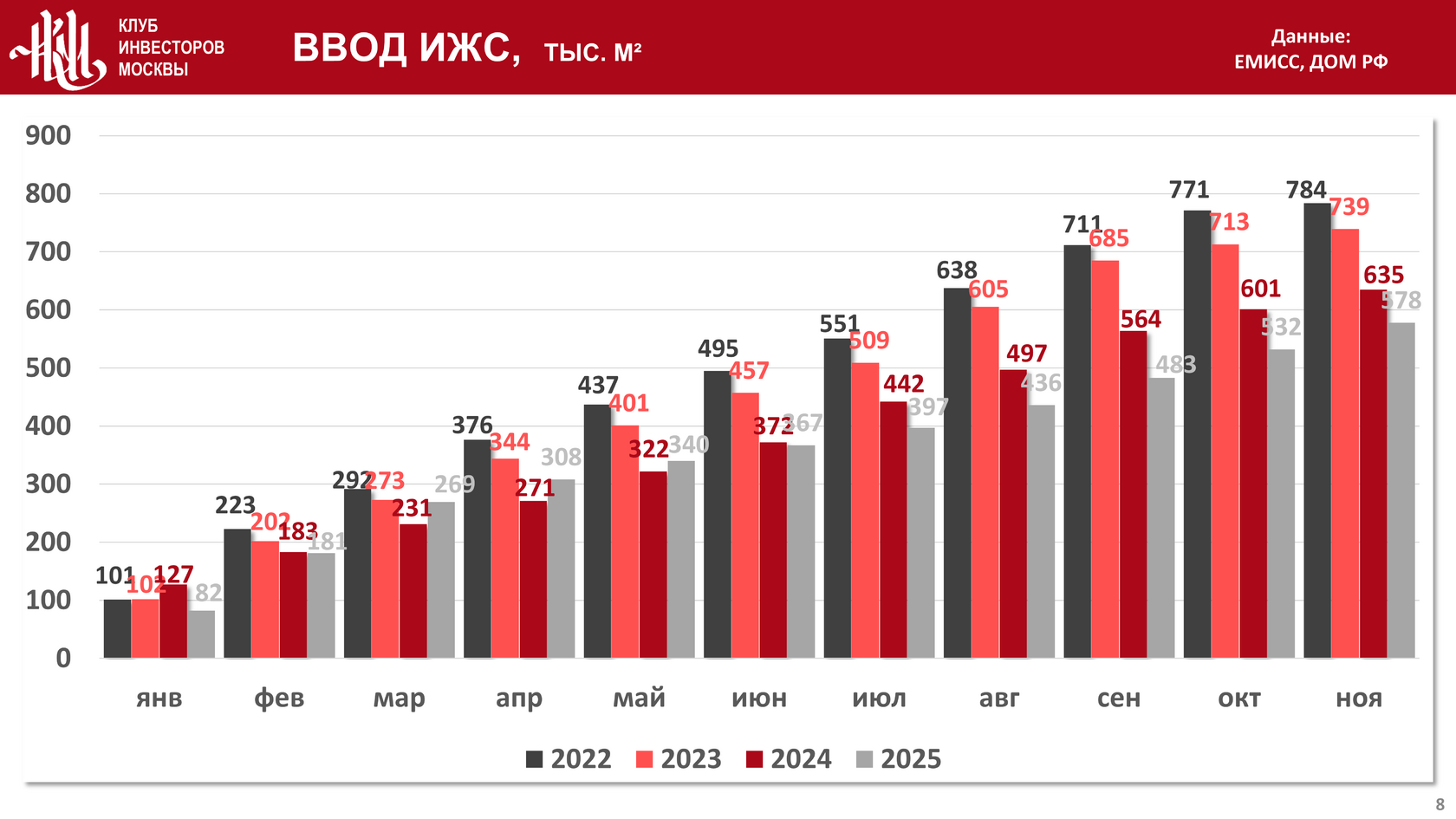 Суммарный объем ввода с начала года в индивидуальном жилищном строительстве (ИЖС) к декабрю 2025 года составил 578 тыс. кв. м., что на 9% и на 21,8% меньше, чем за аналогичный период в 2024 и 2023 годах соответственно: