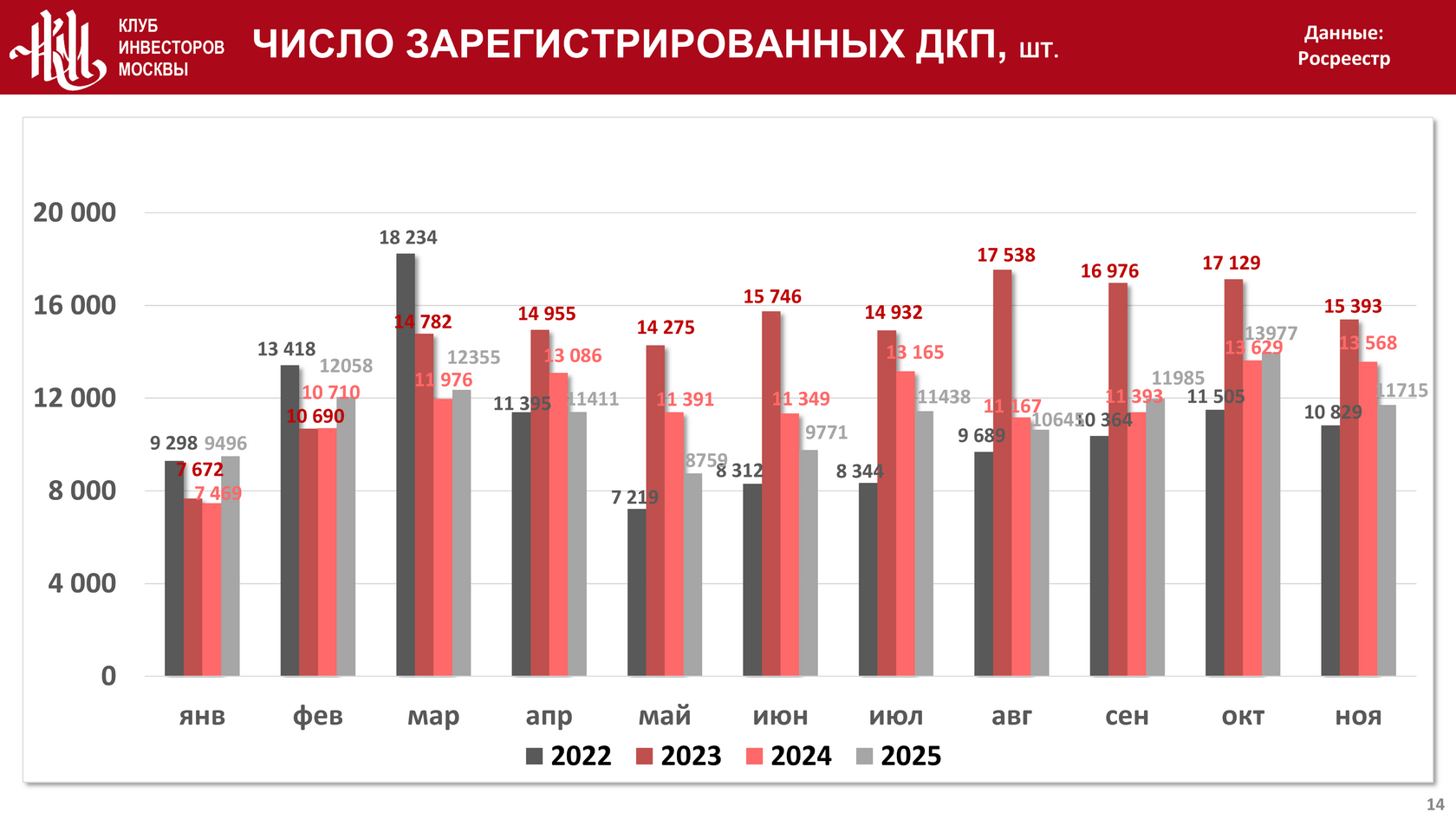 По итогам ноября 2025 года в Москве в отношении жилой недвижимости было зарегистрировано 8 285 договоров участия в долевом строительстве (ДДУ) на объекты жилой недвижимости, что на 14,6% больше и на 24% меньше значения аналогичного показателя в 2024 и 2023 годах соответственно:
