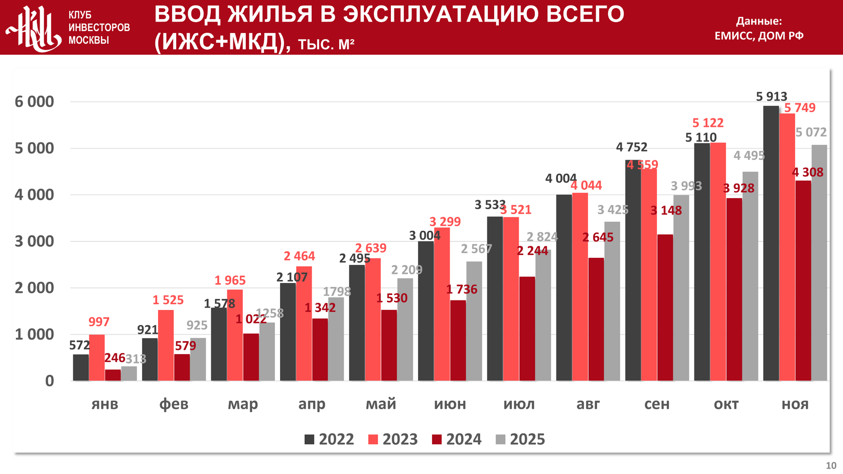 Суммарный ввод жилья за 2025 год составил к началу декабря 5 072 тыс. кв. м., что на 17,7% больше и на 11,8% меньше, чем за тот же период в 2024 и 2023 годах соответственно: