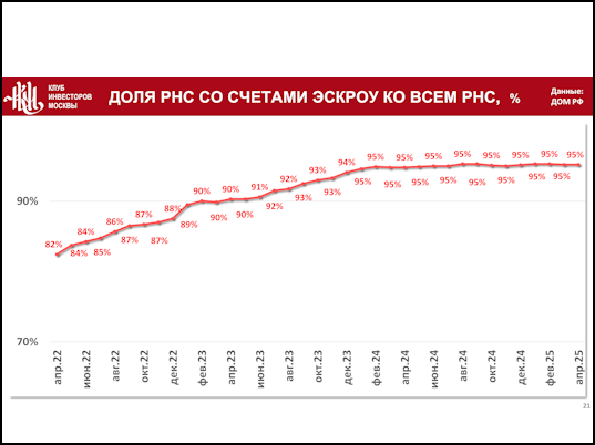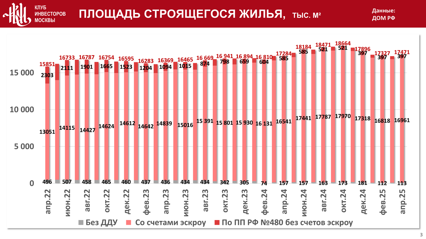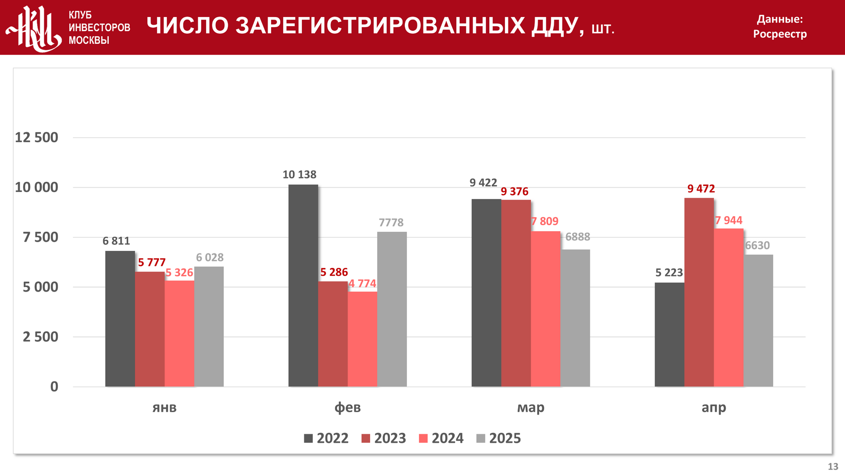 По итогам апреля 2025 года в Москве в отношении жилой недвижимости было зарегистрировано 6 630 договоров участия в долевом строительстве (ДДУ) на объекты жилой недвижимости, что на 16,5% и на 30% меньше аналогичных показателей 2024 и 2023 года:
