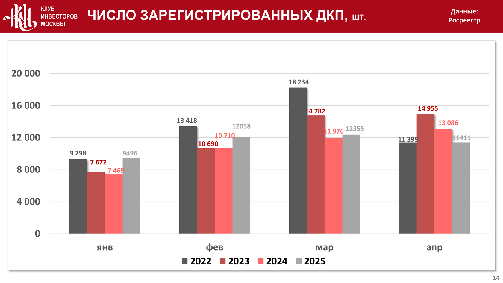 Число зарегистрированных договоров купли-продажи (ДКП) в апреле 2025 года составило 11 411 шт. Количество договоров уменьшилось на 12,8% и на 23,7% по сравнению со значениями аналогичных показателей в 2024 и 2023 годах соответственно: