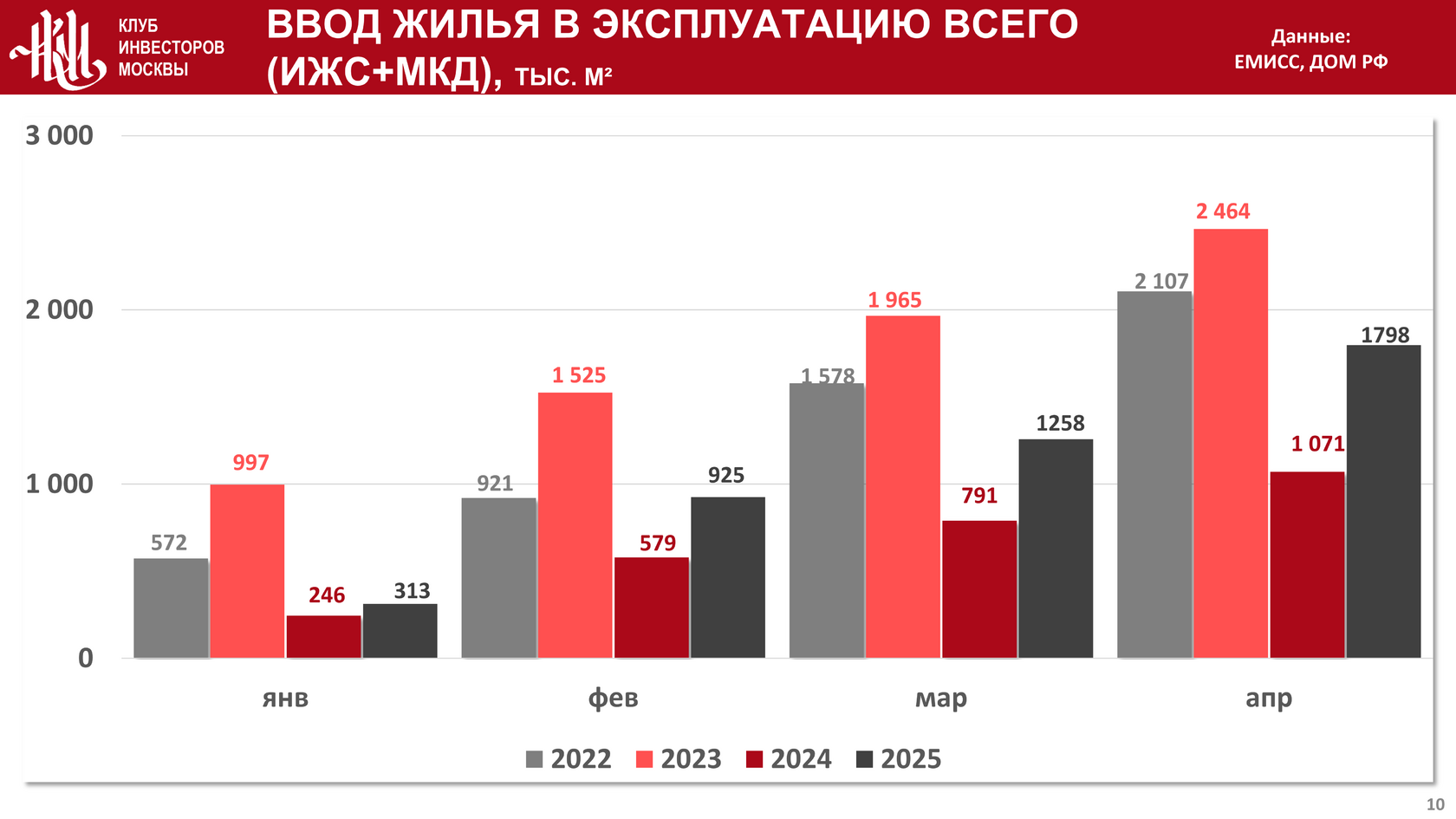 Суммарный ввод жилья за 2025 год составил 1 798 тыс. кв. м., что на 67,9% больше и на 27% меньше, чем за тот же период в 2024 и 2023 годах соответственно:
