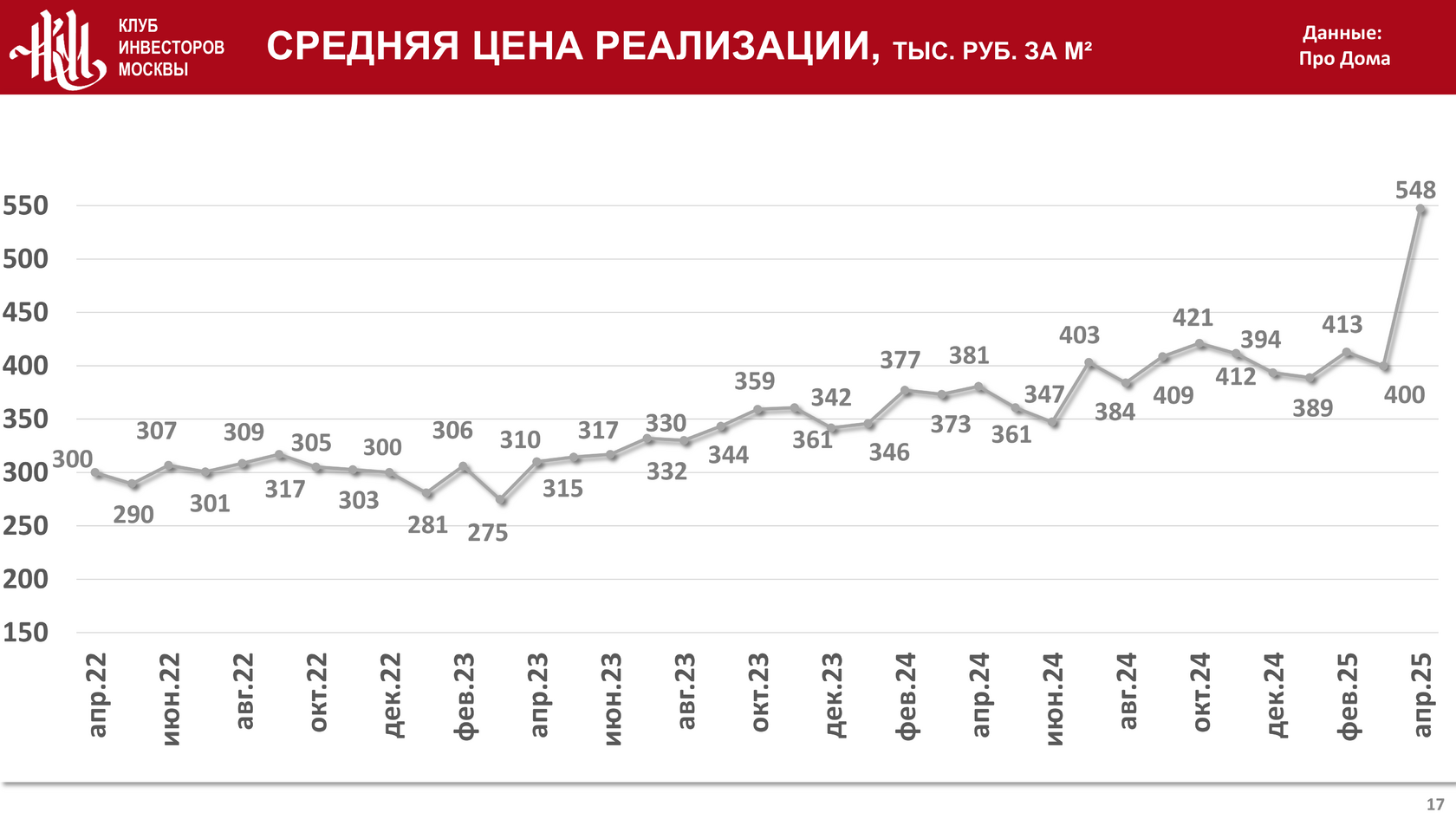 Средняя цена реализации составила 547,5 тыс. руб. за кв. м. что на 43,7% и на 76,4% больше значений аналогичных показателей в 2024 и 2023 годах соответственно: