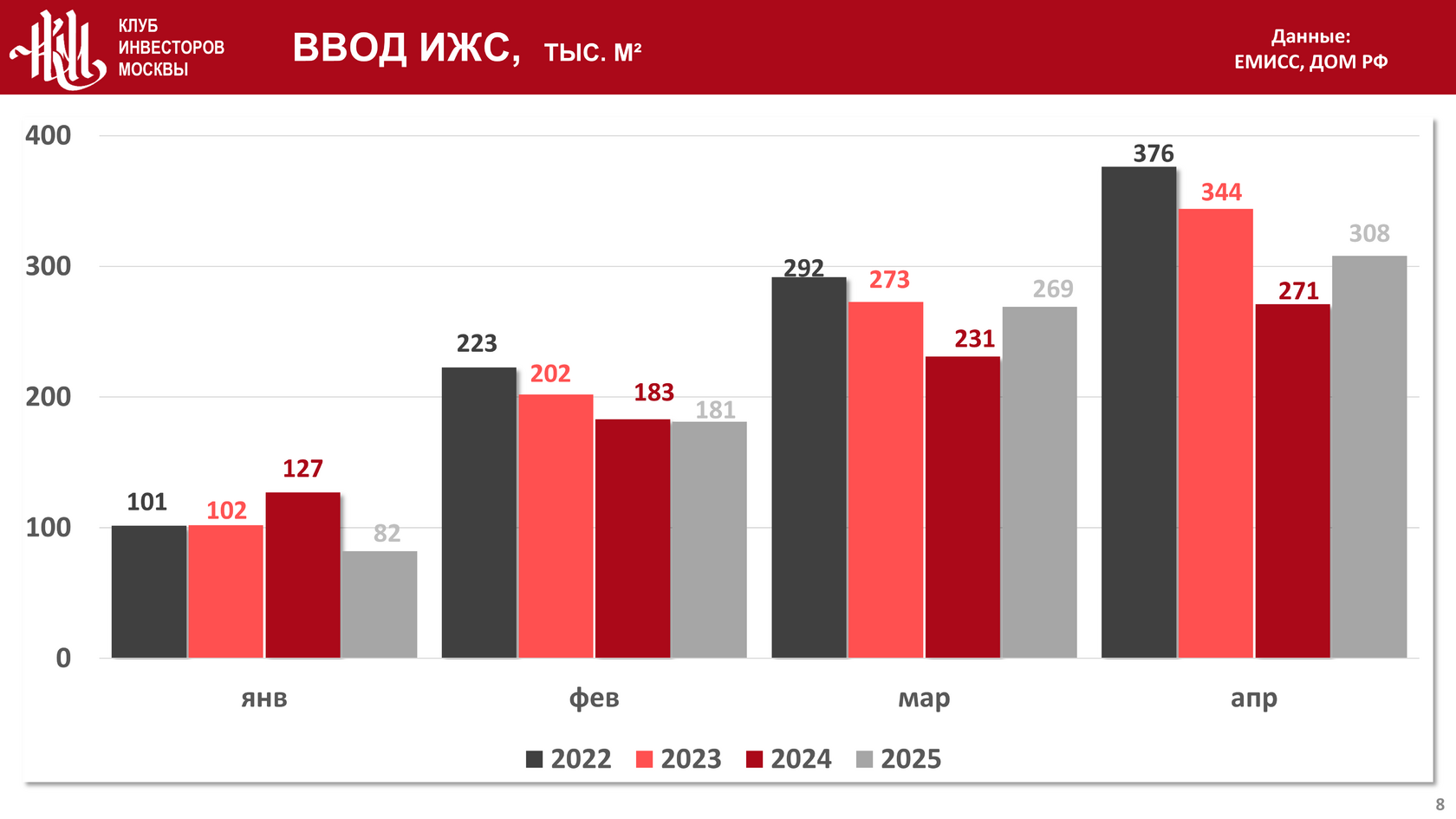 Суммарный объем ввода с начала года в индивидуальном жилищном строительстве (ИЖС) к маю 2025 года составил 308 тыс. кв. м., что на 13,7% больше и на 10,5% меньше, чем за аналогичный период в 2024 и 2023 годах соответственно: