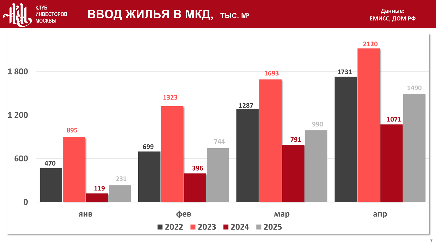 Объем ввода в многоквартирных жилых домах (МКД) в апреле 2025 года составил 1 490 тыс. кв. м., что на 39,1% больше и на 29,7% меньше значений аналогичного показателя в 2024 и 2023 годах соответственно. По сравнению с апрелем 2022 года объем ввода в МКД сократился на 13,9%:
