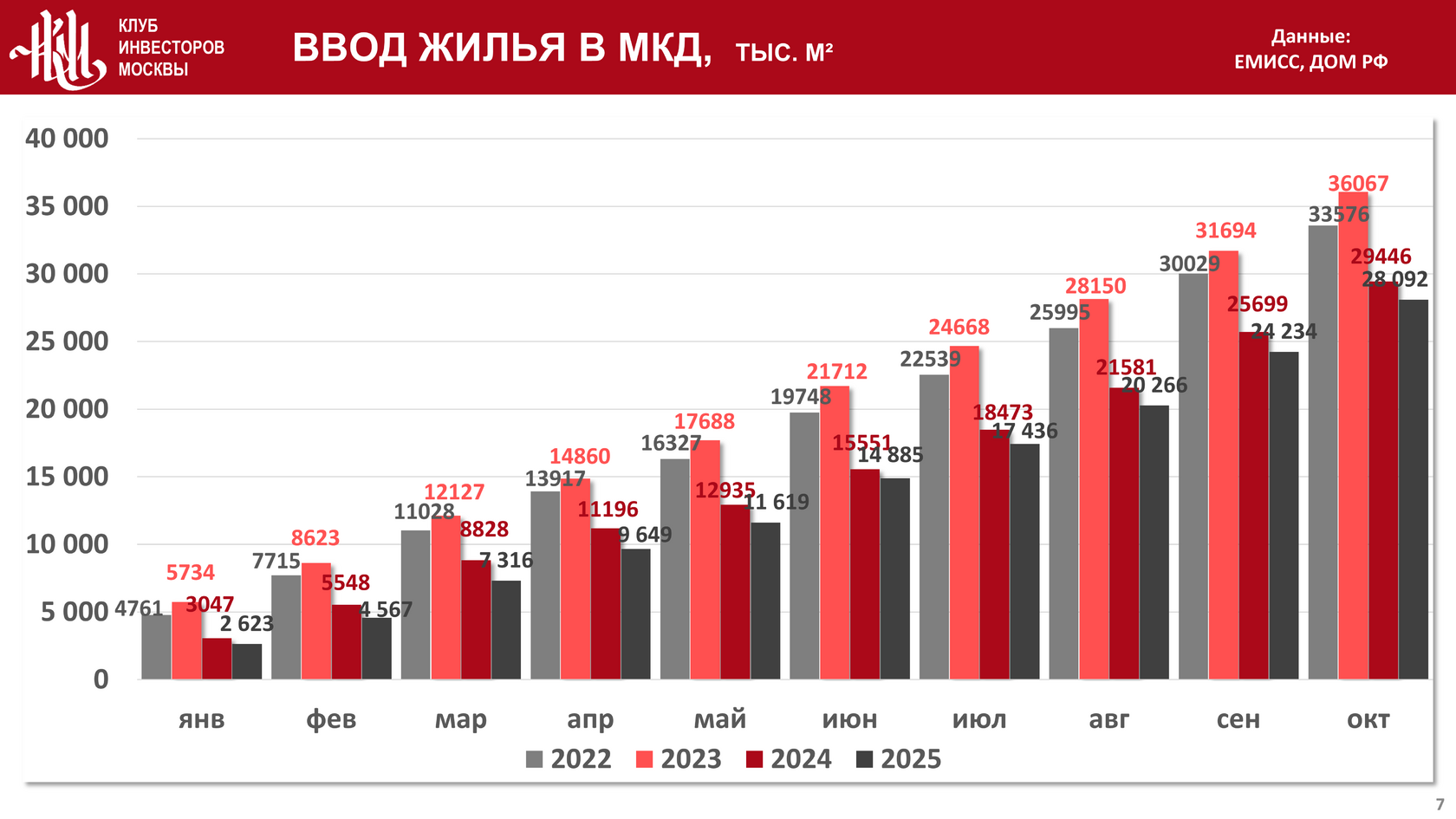 Фактический объем ввода с начала года в эксплуатацию многоквартирных жилых домов (МКД) составил 28 092 тыс. кв. м., что на 4,6% и на 22,1% меньше, чем на конец октября 2024 и на конец октября 2023 года соответственно:
