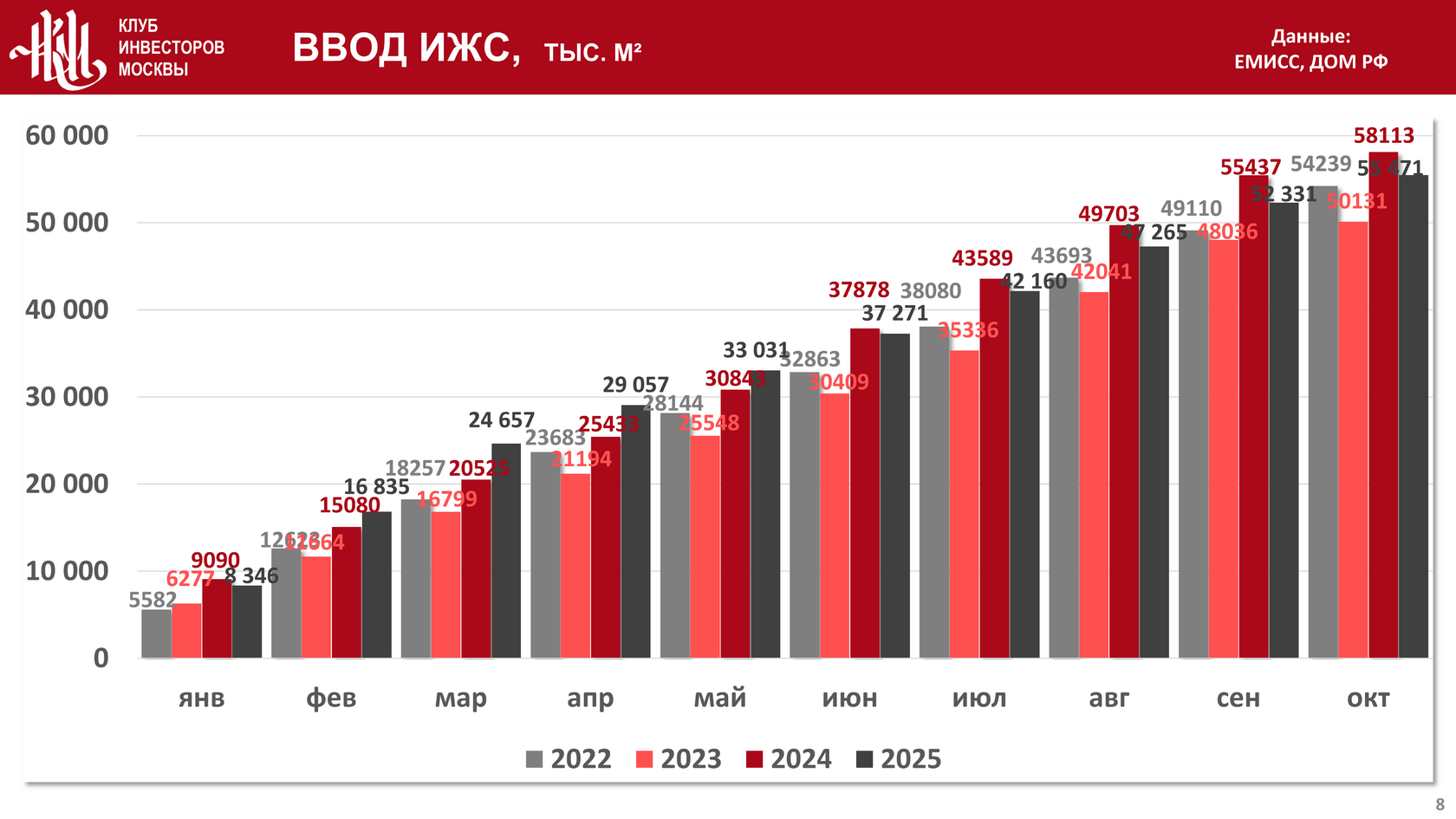Ввод с начала года в эксплуатацию объектов индивидуального жилого строительства (ИЖС) к началу ноября 2025 года составил 55 471 тыс. кв. м., что на 4,5% меньше и на 10,7% больше, чем за тот же период в 2024 и в 2023 годах соответственно: