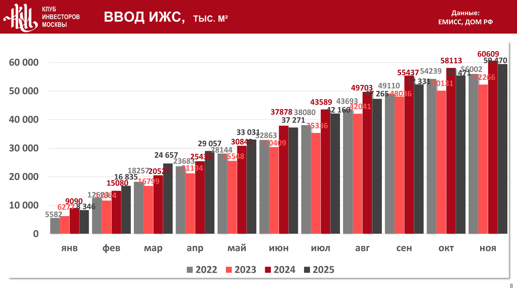 Ввод с начала года в эксплуатацию объектов индивидуального жилого строительства (ИЖС) к началу декабря 2025 года составил 59 470 тыс. кв. м., что на 1,9% меньше и на 13,8% больше, чем за тот же период в 2024 и в 2023 годах соответственно: