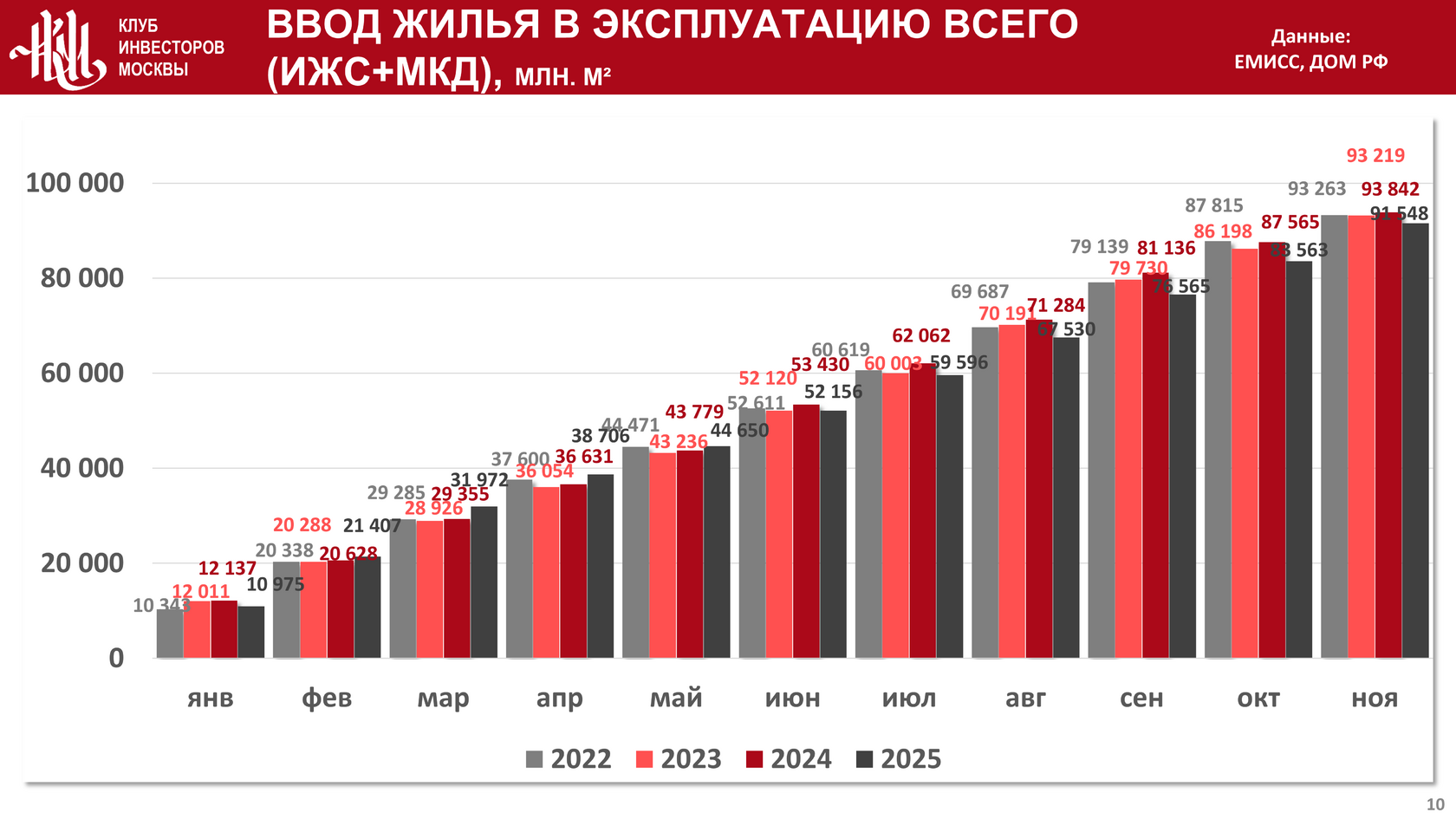Суммарный объем ввода жилья в эксплуатацию в текущем году составил 91 548 тыс. кв. м. По сравнению с 2024 годом объем ввода жилья упал на 2,4% и на 1,8% по сравнению со значением аналогичного показателя в 2024 и в 2023 году соответственно: