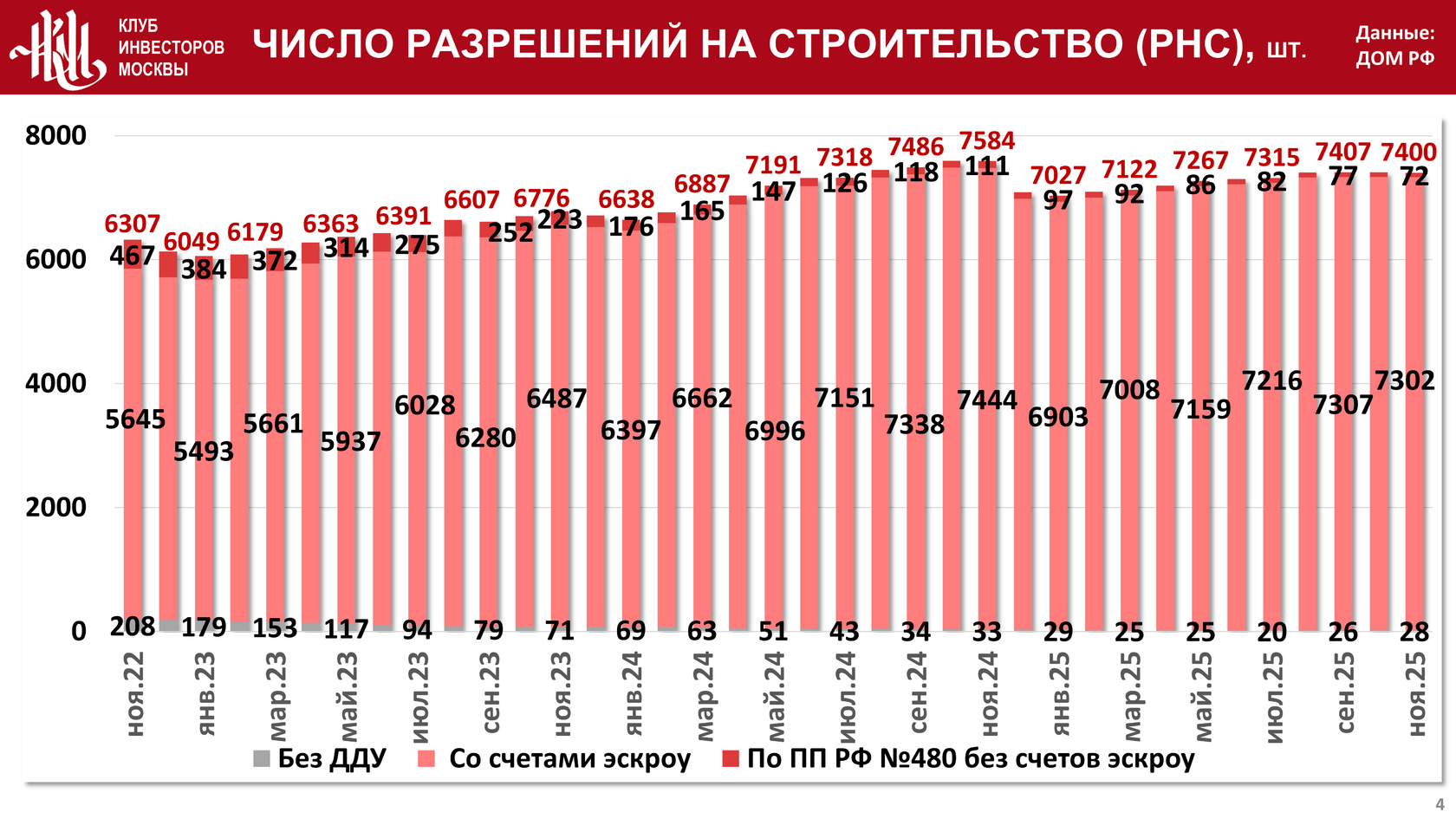 Число действующих разрешений на строительство (РнС) составило 7 400 шт., что на 2,4% меньше значения этого показателя в 2024 году и на 9,2% больше значения этого показателя в 2023 году за аналогичный период:
