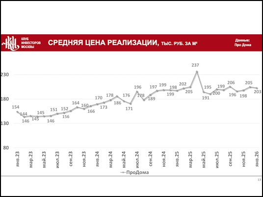 Средняя цена реализации составила 202,8 тыс. руб. за кв. м., что на 2,6% и на 19,4% больше аналогичного показателя в январе 2025 и в январе 2024 года соответственно: